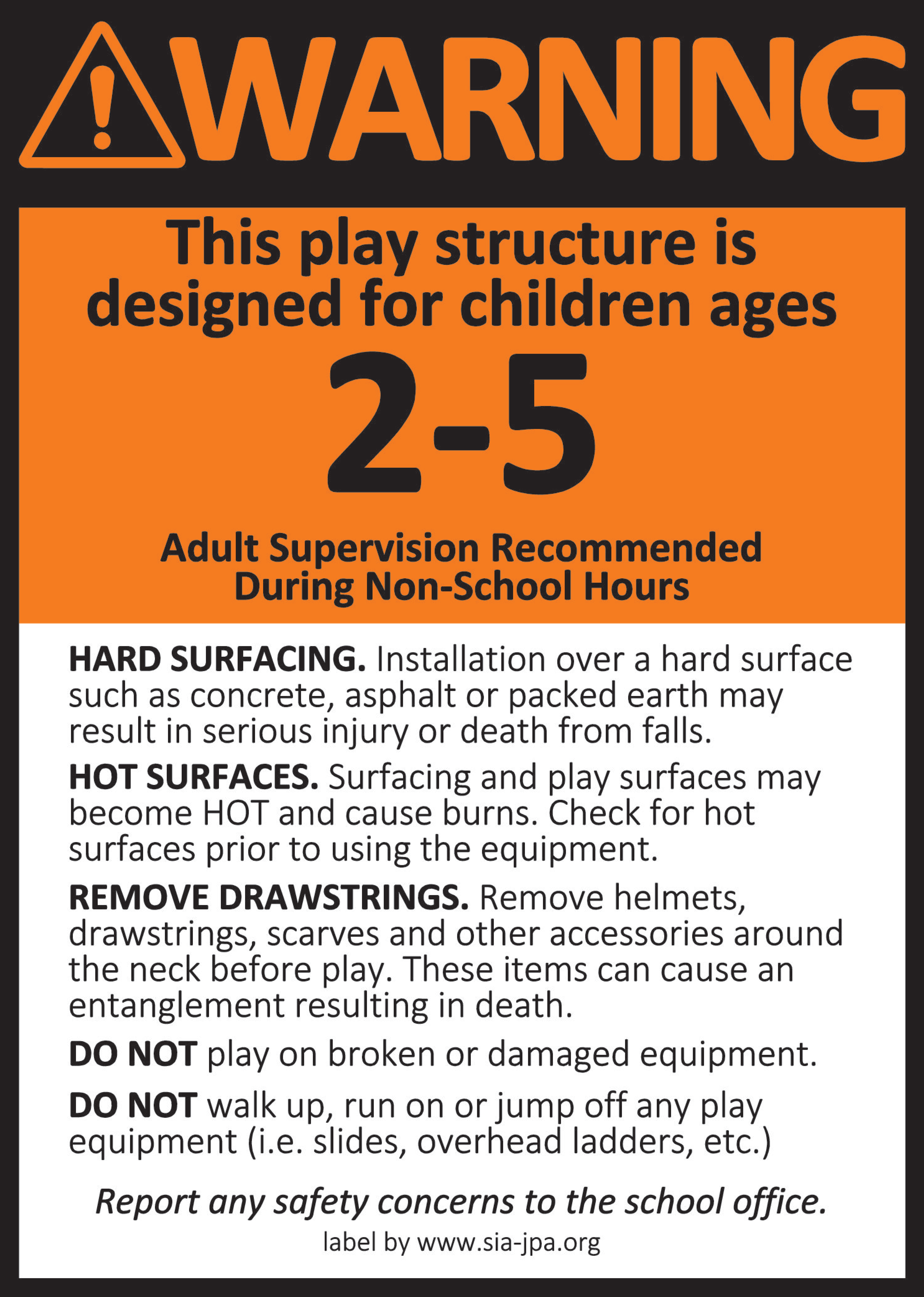 !Warning This play structure is designed for children ages 2-5. Adult Supervision Recommended During Non-School Hours. HARD SURFACING. Installation over a hard surface such as concrete, asphalt or packed earth may result in serious injury or death from falls.HOT SURFACES. Surfacing and play surfaces may become HOT and cause burns. Check for hot surfaces prior to using the equipment. REMOVE DRAWSTRINGS. Remove helmets, drawstrings, scarves and other accessories around the neck before play. These items can cause an entanglement resulting in death. DO NOT play on broken or damaged equipment. DO NOT walk up, run on or jump off any play equipment (i.e. slides, overhead ladders, etc.) Report any safety concerns to the school office. label by www.sia-jpa.org
