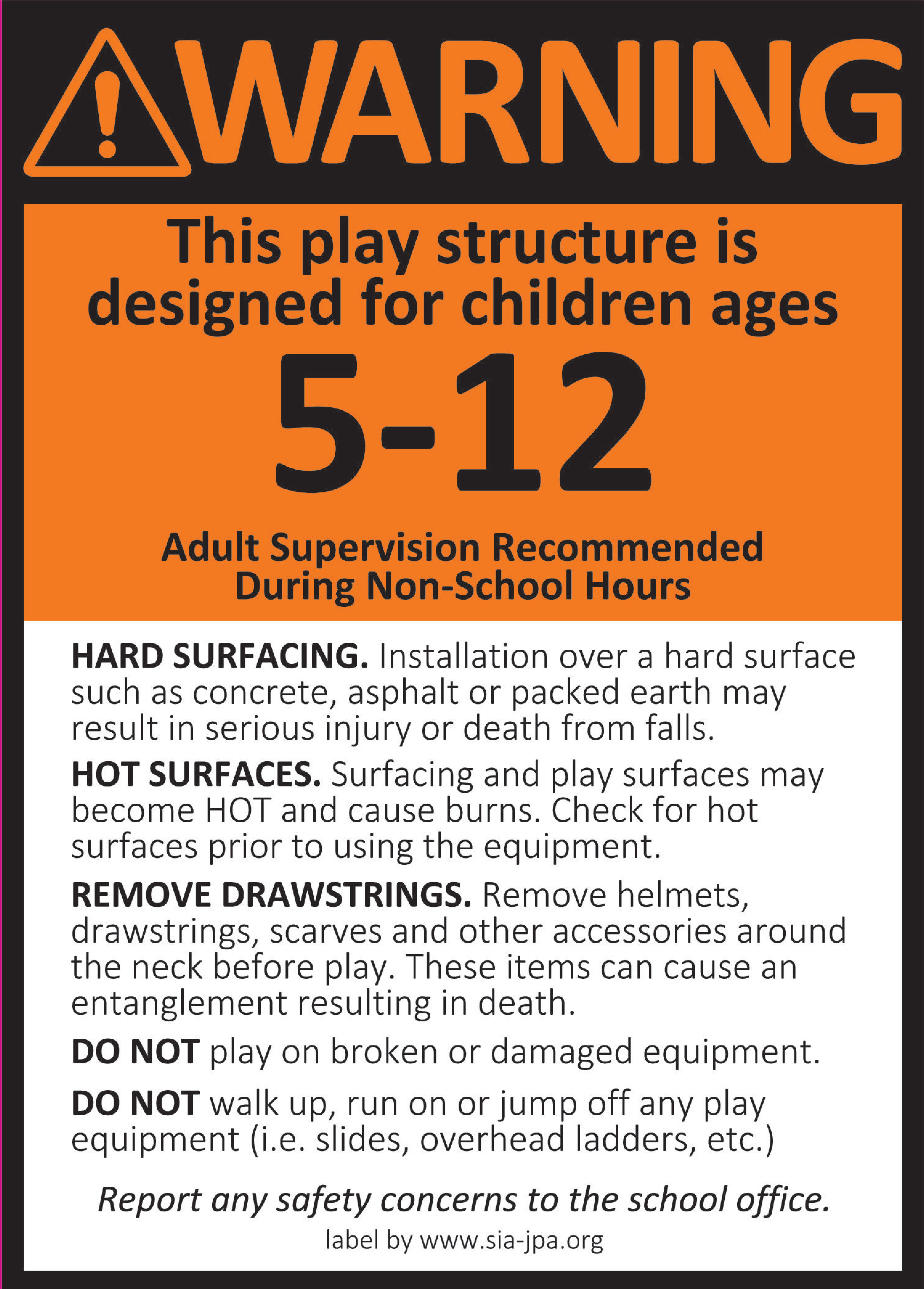 !Warning This play structure is designed for children ages 5-12. Adult Supervision Recommended During Non-School Hours. HARD SURFACING. Installation over a hard surface such as concrete, asphalt or packed earth may result in serious injury or death from falls. HOT SURFACES. Surfacing and play surfaces may become HOT and cause burns. Check for hot surfaces prior to using the equipment. REMOVE DRAWSTRINGS. Remove helmets, drawstrings, scarves and other accessories around the neck before play. These items can cause an entanglement resulting in death. DO NOT play on broken or damaged equipment. DO NOT walk up, run on or jump off any play equipment (i.e. slides, overhead ladders, etc.) Report any safety concerns to the school office. label by www.sia-jpa.org