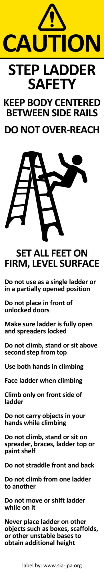 Caution. Step Ladder Safety. Keep body centered between side rails. Do not over-reach. Set All Feet On Firm, Level Surface. Do not use as a single ladder or in the partially open position. Do not place in front of unlocked doors. Do not climb, stand or sit above second step from top. Make sure ladder is fully open and spreaders locked. Use both hands in climbing. Climb only on from side of ladder. Do not carry objects in your hands while climbing. Do not climb, stand or sit on spreader braces, ladder top or paint shelf. Do not straddle front and back. Do not climb from one ladder to another. Do not walk or shift ladder while on it. Never placer ladder on other objects such as boxes, scaffolds or other unstable bases to obtain additional height.